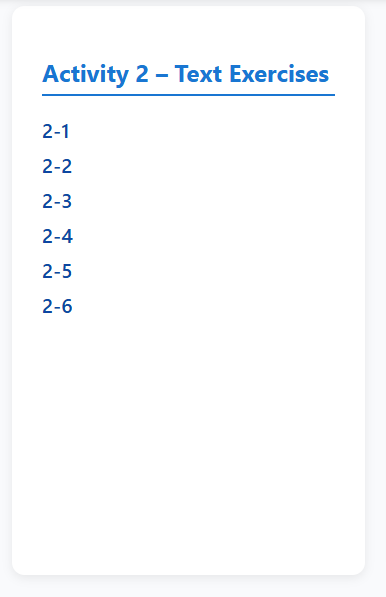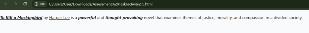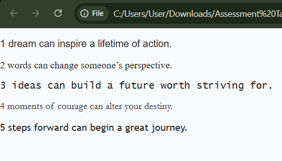 This activity helped me understand how plain text content is displayed on a webpage. I learned how text appears by default in a browser and how spacing and line breaks affect readability.